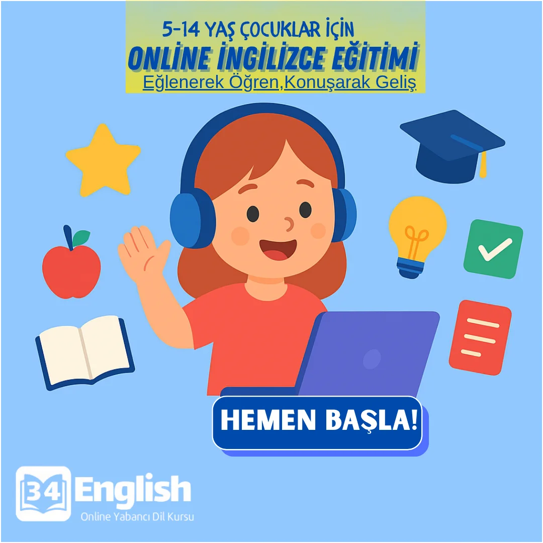 34English Eğitim ekibi olarak, 5–14 yaş arası çocuklara eğlenceli, interaktif ve öğretici online İngilizce dersleri sunuyoruz.